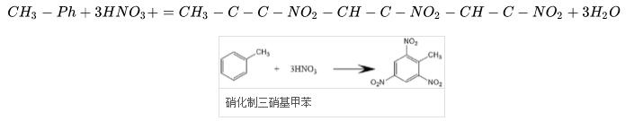 這種反應(yīng)常被利用來(lái)生產(chǎn)2,4,6—三硝基甲苯(即TNT),方程式: