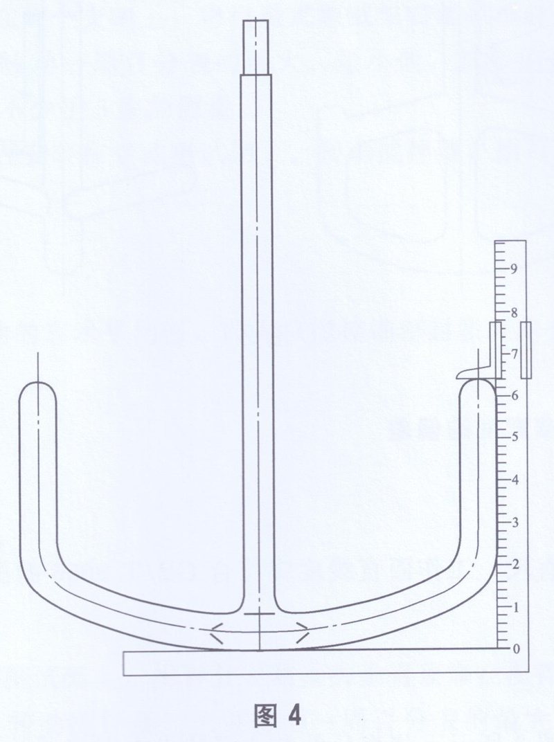 將待測攪拌器放平,如圖4所示,將直角尺的長邊和短邊緊貼在攪拌器錨翼上,移動滑塊到攪拌器錨翼端點(diǎn),在長邊上讀出攪拌器錨翼的高度,取攪拌器兩個(gè)錨翼的高度平均值與標(biāo)準(zhǔn)高度之差的絕對值作為攪拌器錨翼高度與標(biāo)準(zhǔn)高度的偏差。