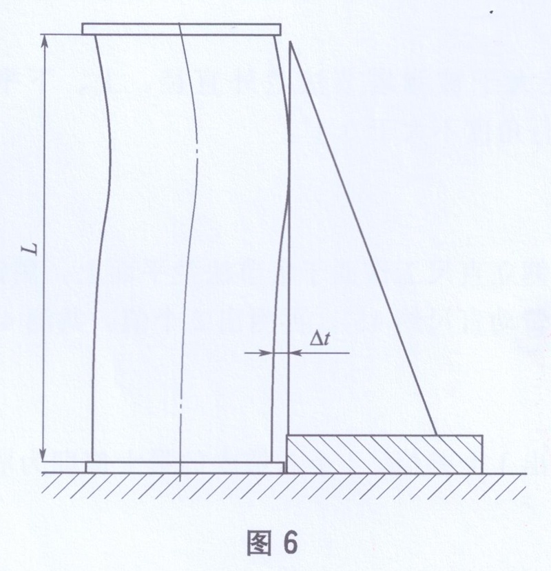 將被測塔節(jié)法蘭端放置在平臺上,在緊靠法蘭邊處墊放一平行度標(biāo)準(zhǔn)圓墊塊,用直角尺貼靠在塔節(jié)壁上 (如圖6所示),旋轉(zhuǎn)塔節(jié),用塞尺量取旋轉(zhuǎn)一周中塔節(jié)壁與直角邊的最大距離AL,此值即為塔節(jié)直線度。