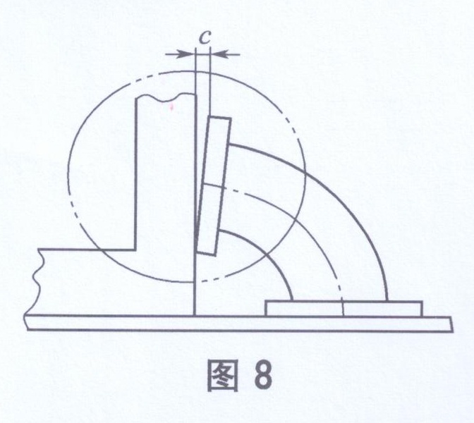 將被測管件(彎頭)法蘭一端放置在平臺上,緊貼另一端法蘭面處放專用直角尺(如圖8所示),長邊比管件(彎頭)法蘭外徑最高處稍長,用塞尺量取法蘭外徑最高處與直角尺長邊的最大距離c,此值即為管件(彎頭)法蘭對(另一側(cè))法蘭的垂直度。