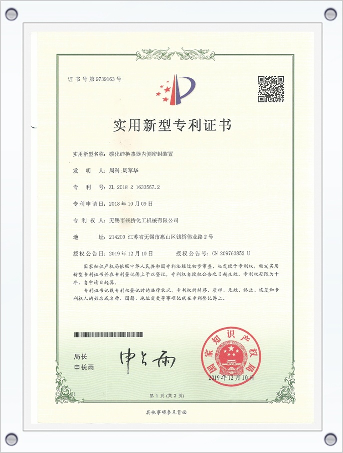 碳化硅換熱器內(nèi)測密封裝置專利證書