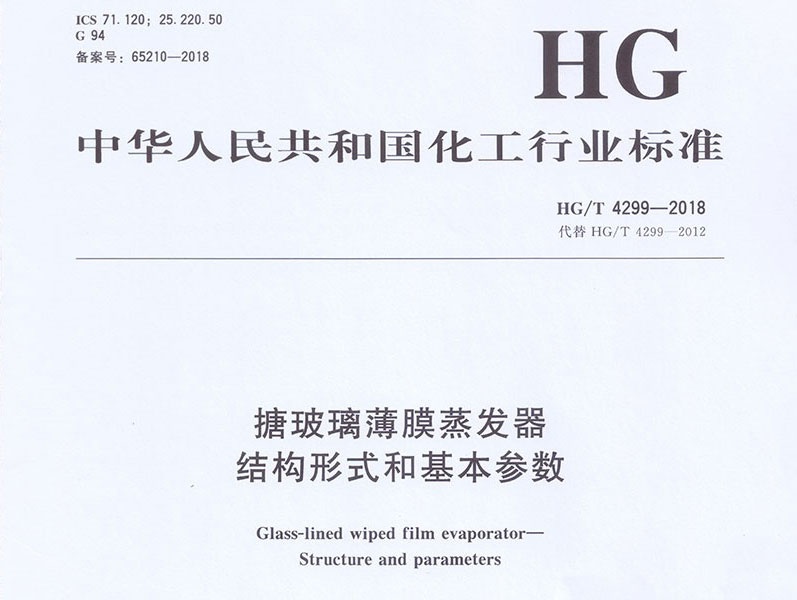 無(wú)錫錢橋化工機(jī)械有限公司參與起草中華人民共和國(guó)化工行業(yè)標(biāo)準(zhǔn)HG/T 4299-2018《搪玻璃薄膜蒸發(fā)器結(jié)構(gòu)形式和基本參數(shù)。 ...