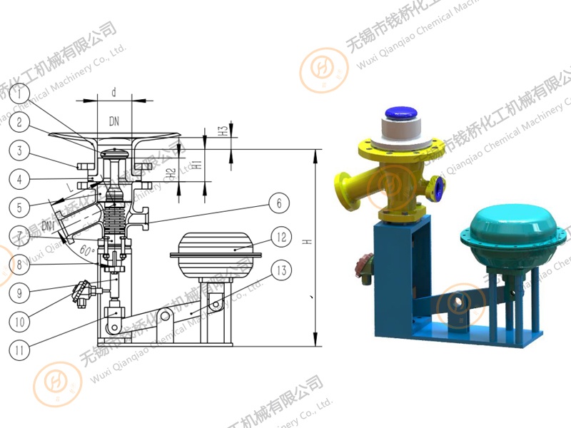 搪玻璃上展式自動(dòng)放料閥(側(cè)向執(zhí)行機(jī)構(gòu)) *內(nèi)置測(cè)溫氣動(dòng)放料閥